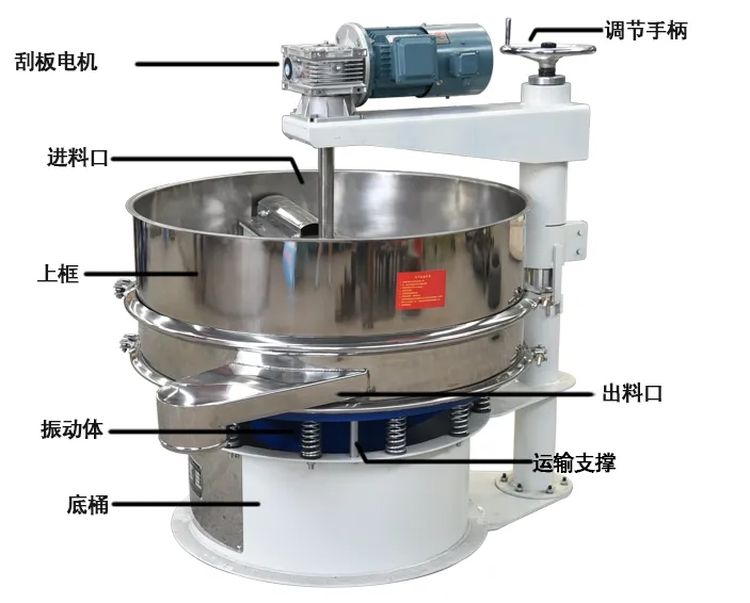 便于加強振動篩篩網的自清潔功能,例 如在面粉篩分中,有些細渣子易于掉落在網孔中,在刮板旋轉推動的作用下,