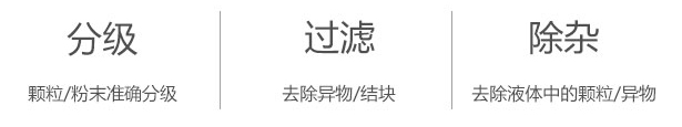 任何顆粒、粉末、粘液一定范圍內均可篩選。篩分細至500目或0.028mm, 過濾小可至5微米。分級篩選,可篩一至五層篩網,能同時進行二至六個等級的分選或過濾。