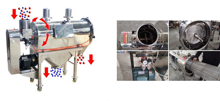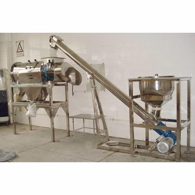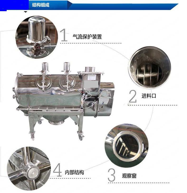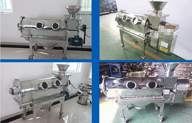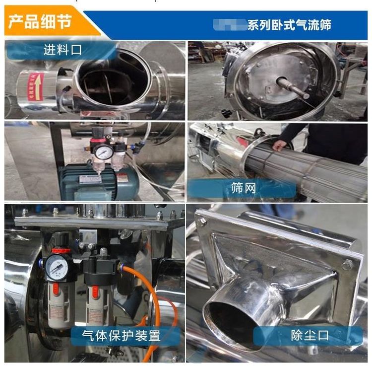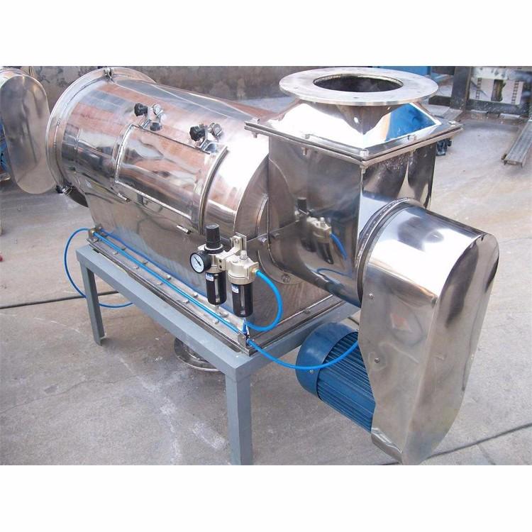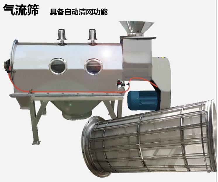 臥式氣流篩篩網(wǎng)為圓筒狀,置于機體內(nèi),物料通過螺旋輸送系統(tǒng)后,和氣流混合、霧化進入網(wǎng)筒內(nèi);