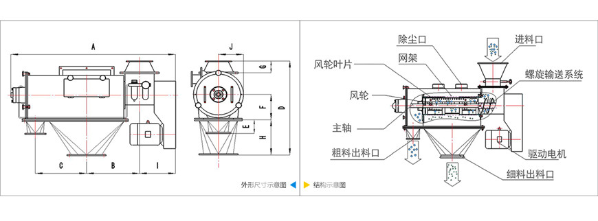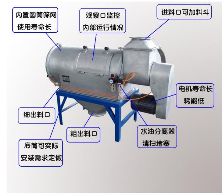 通過網(wǎng)筒內(nèi)風輪葉片使物料同時受離心力和旋風推進力,從而迫使物料噴射過網(wǎng),由細料排出口排出,不能過網(wǎng)的物料沿網(wǎng)筒壁從粗料排出口排出。