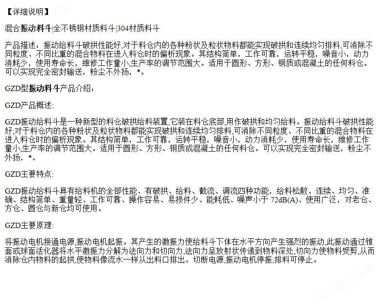 將振動由機接通由源攝動由機起振。且產(chǎn)生的激振力使給料斗下體在水平方向產(chǎn)生強列的振動此振動通過錐面或球面活化器將水平激振力分解為法向力和切向力法向力呈放射狀傳遞到物料深處切向力使物料受剪從而消除倉內(nèi)物料的起拱使物料像流水一樣從出料口排出。切斷電源振動電機停振排料可停止。