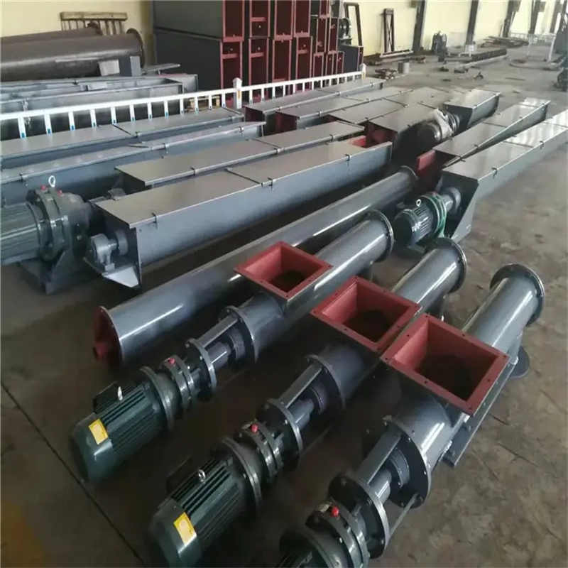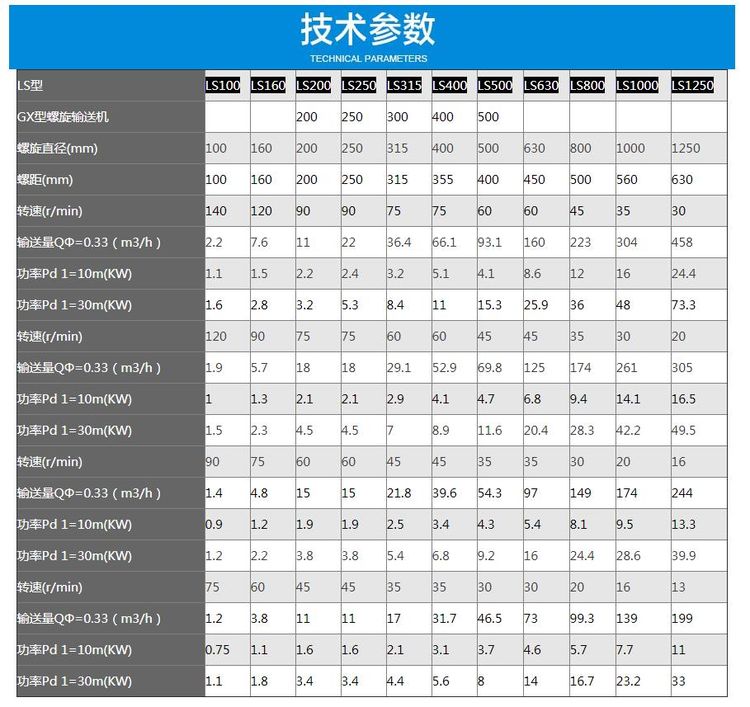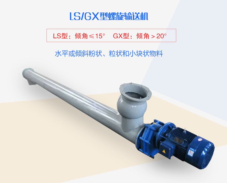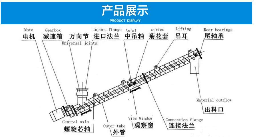 LS型螺旋輸送機是利用旋轉的螺旋將被輸送的物料沿固定的機殼內推移而進行輸送工作,頭部及尾部軸承移至殼體外,吊軸承采用滑動軸承設有防塵密封裝置,軸瓦一般采用粉末冶金,輸送水泥采用毛氈軸瓦,吊軸和螺旋軸采用滑塊連接。