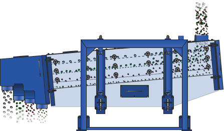 設備的篩箱在慣性力的作用下作前后往復運動,并帶動篩面做周期性搖動,迫使篩面上的物料隨篩箱一同做定向跳躍式運動,小于篩面孔徑的物料通過篩框落到下層,稱為篩下物,大于篩面孔徑的物料經連續翻滾跳躍運動后從排料口排出,完成篩分作業。
